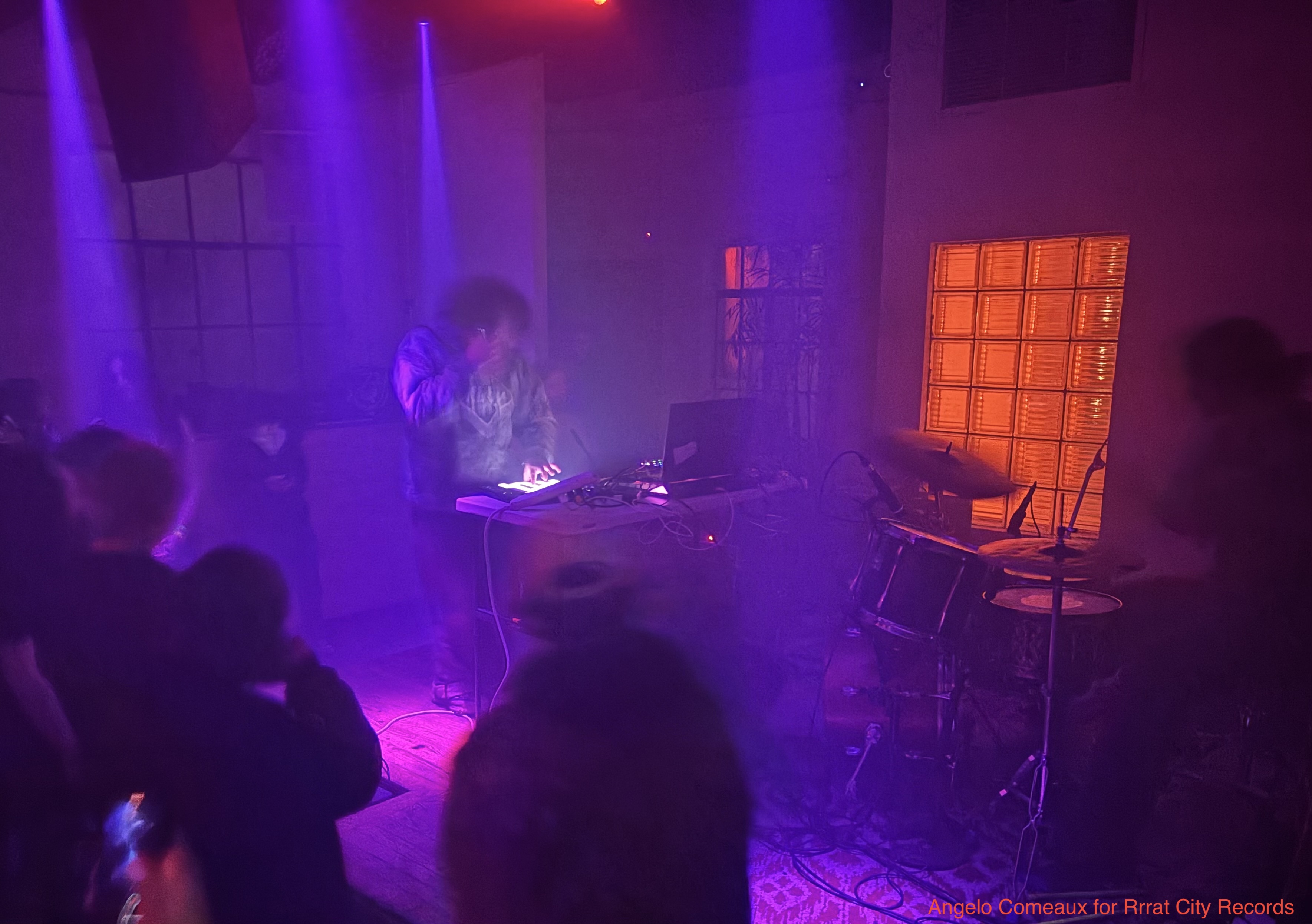 Flesh Produce flew nearly 2,500 miles for their set and proceeded to put on a clinic of complete rhythmic mania. Their drummer sounded like three drummers, unleashing hysterically fast blast beats while also triggering warping samples effortlessly. This duo of drums and vocals was locked in and metronomically perfect. They were also undeniably fun. No territory was off limits, the vocalist strutted around the stage, jumped into the pit, and at one point climbed the top of a seating booth to crouch like a skyscraper's Gargoyle and spit their lines.