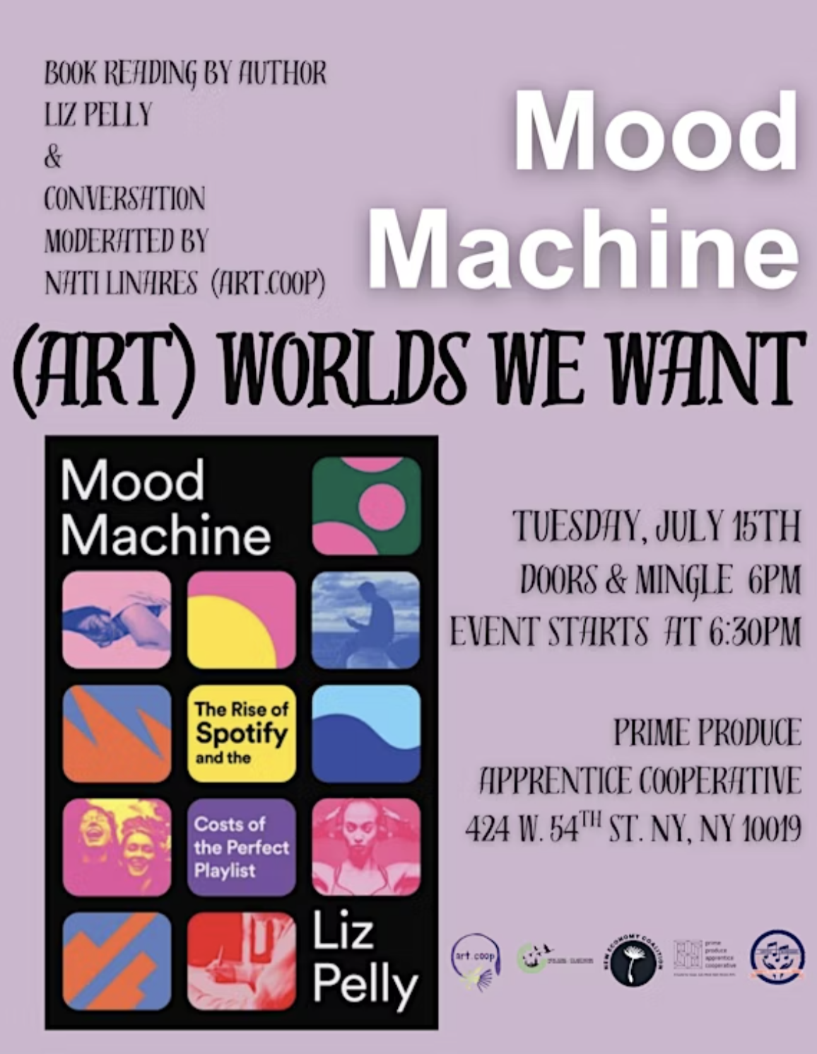 There’s a great book out right now called Mood Machine: The Rise of Spotify and the Costs of the Perfect Playlist, by Liz Pelly. You may be thinking “I know the cost of my playlist, Spotify premium is $11.99 a month!”. You’d be right in that regard, but this book dives much deeper than that, starting from Spotify’s 2006 origins as a humble multi-million dollar venture capital backed advertising platform to the $150 billion streaming giant it is today. The cost of Spotify’s journey, for artists, for musicians, for workers, for independents, for listeners, has been steep, and a constant question is repeated throughout the tracing of the company's history: Who has benefited from the streaming revolution? The answer may surprise you, and this book provides the most comprehensive investigation into that question. So when we learned that the author, Liz Pelly, was teaming up with Art.coop, Prime Produce Apprenticeship Cooperative, New Economy Coalition, United for Musicians and Allied Workers and the Network of NYC Worker Cooperatives to host a reading and community discussion on Tuesday, we high tailed it down 424 W 54th st. to join.