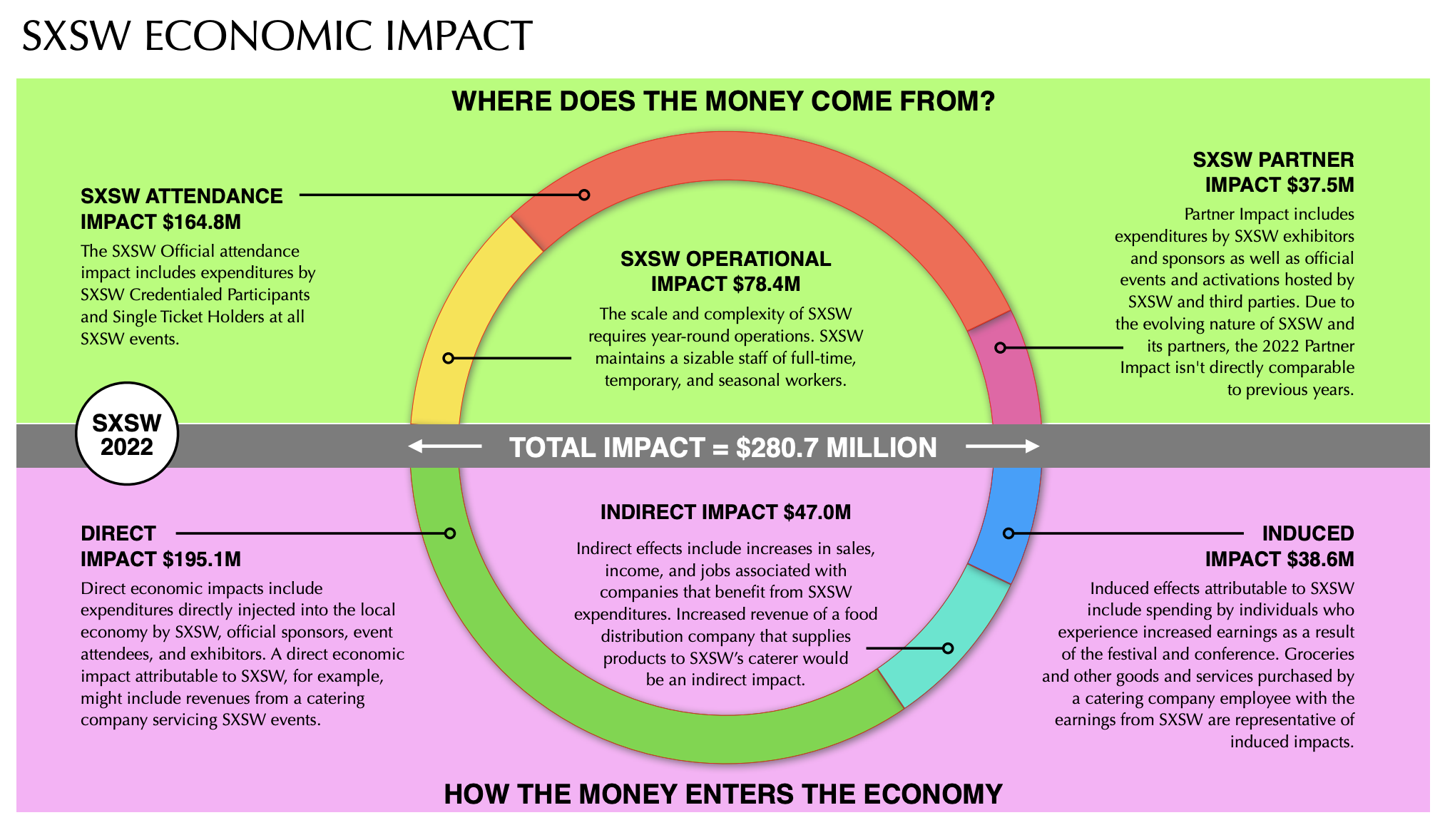 But why? Because the “exposure potential” is so high? Maybe, sounds like the economics of the lottery, but consider this: SXSW’s self published impact report from 2022 contains a graphic slide (see image below) showing that the festival generated $164.8 million in revenue strictly from credentialed participants and ticket holders. Their showcase lineup press release from this year states that 240 artists are on the lineup. Let’s do some rat math to estimate SXSW’s expenses for musical acts. Assuming that all artists take the $350 cash option we get (240 * $350) = $84,000. You’re generating $165,000,000 in revenue but can only afford to pay $84,000 to the artists?