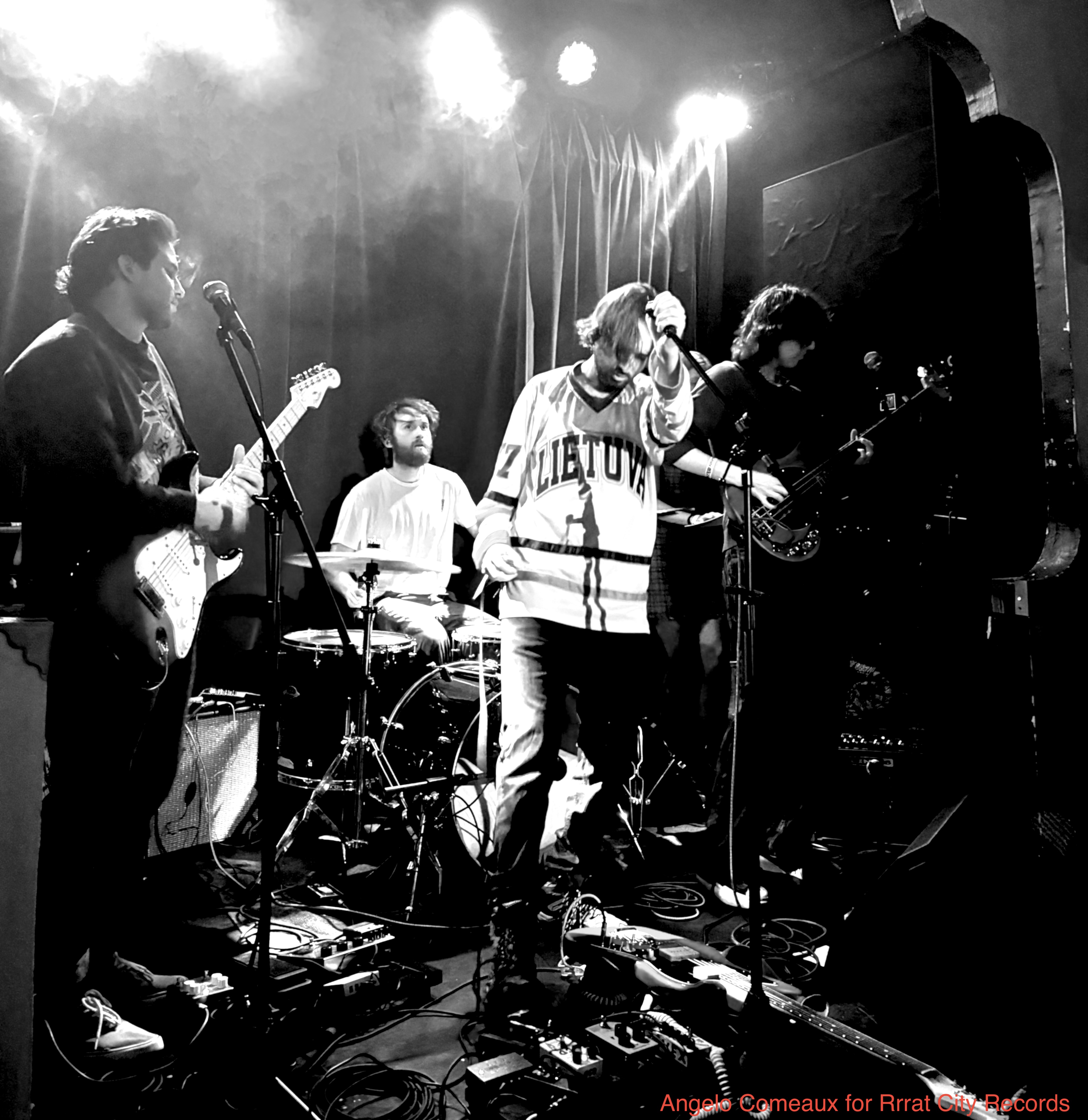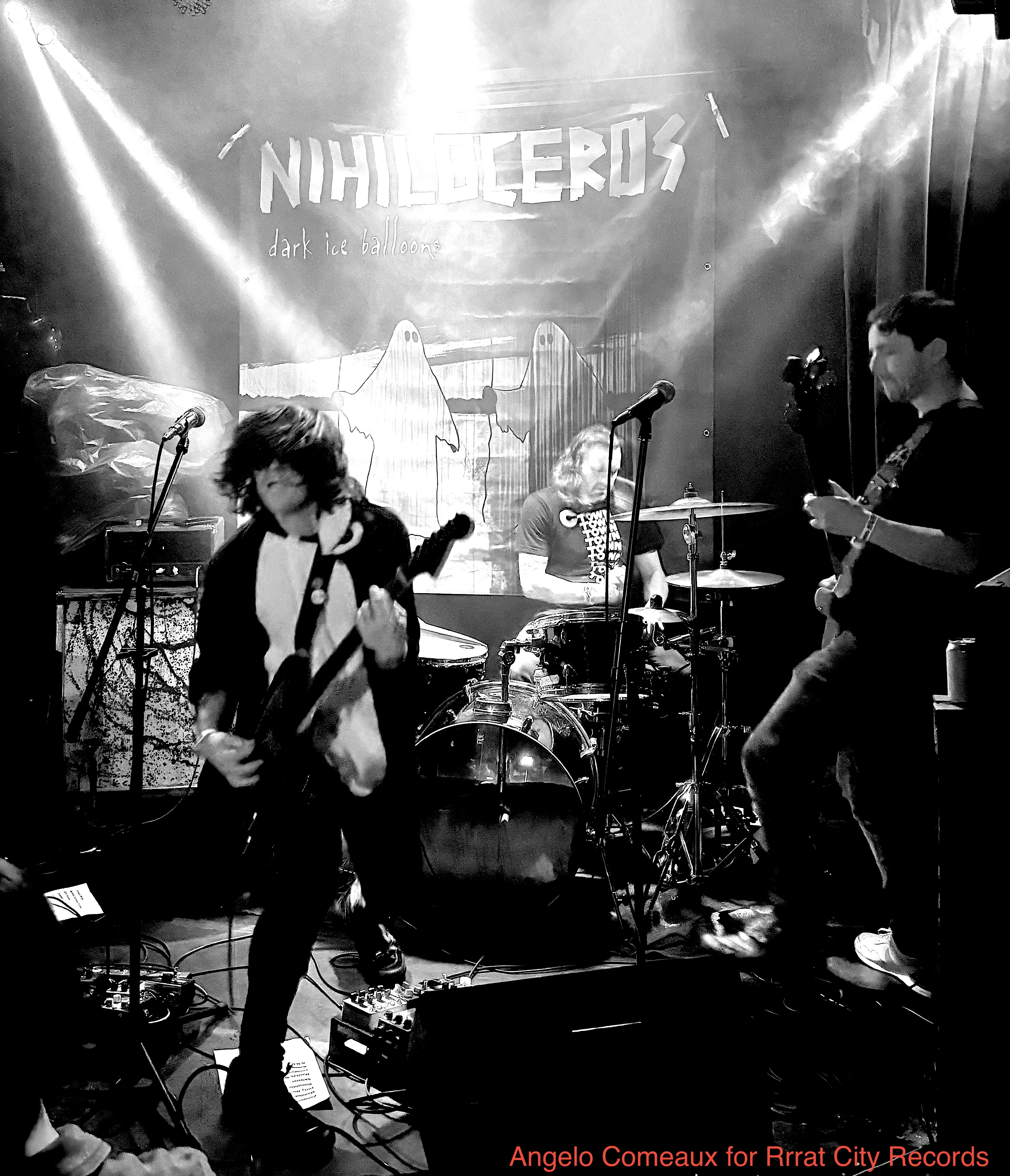 Nihiloceros was celebrating the release of their new album, Dark Ice Balloons. This power trio were master blasters and played what we dub Thrash Rock. It was anthemic, it was relentless. Black balloons of the dark ice variety appeared and ricocheted around the room, bouncing off the sonic assault of sound. These songs were a cruising Boeing 737 with a bunch of loose screws. At hundreds of miles an hour a door seemed ready to blow off at any moment. This is your captain, speaking. Please fasten your seatbelts and prepare to rock.