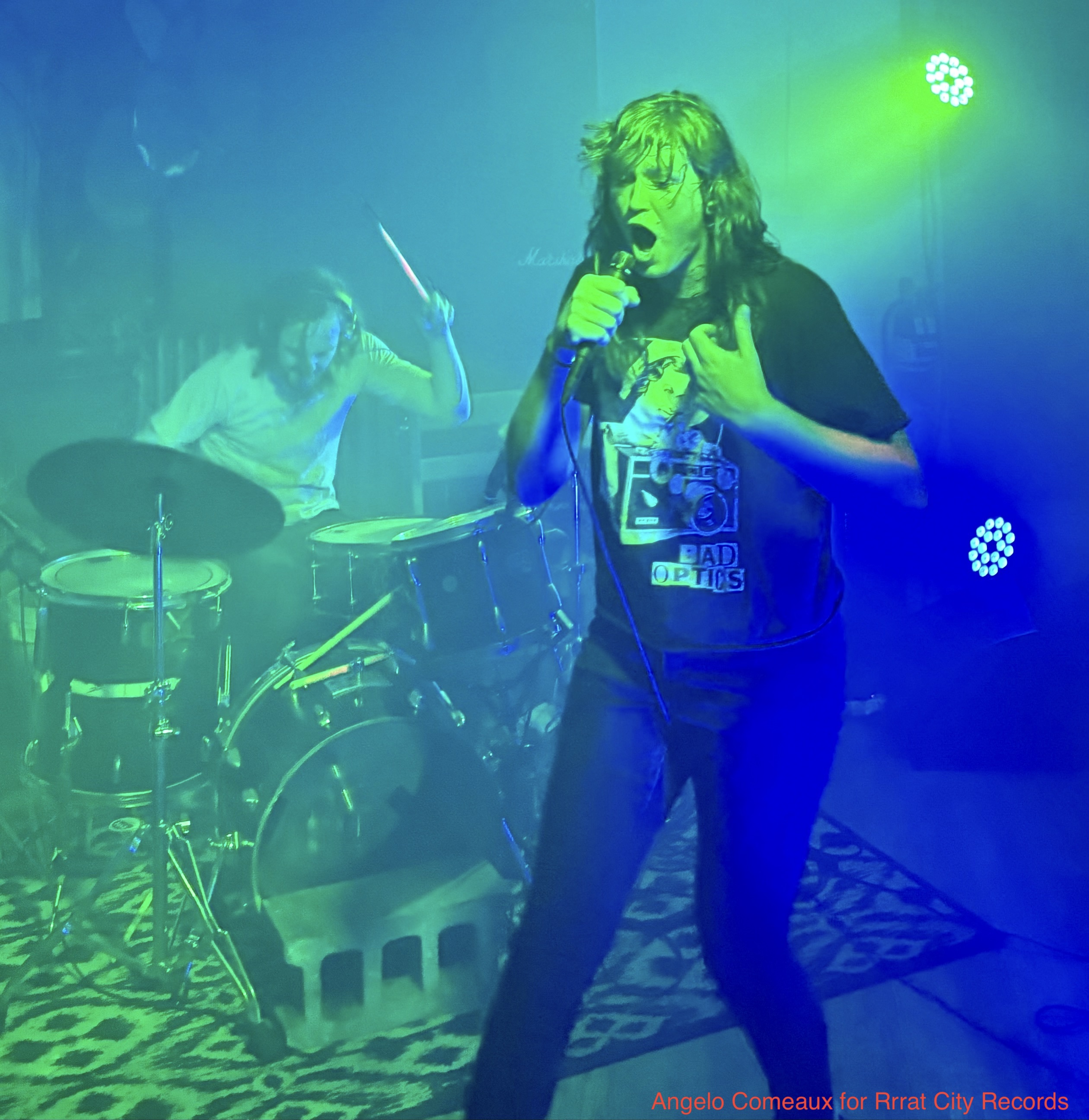Flesh Produce flew nearly 2,500 miles for their set and proceeded to put on a clinic of complete rhythmic mania. Their drummer sounded like three drummers, unleashing hysterically fast blast beats while also triggering warping samples effortlessly. This duo of drums and vocals was locked in and metronomically perfect. They were also undeniably fun. No territory was off limits, the vocalist strutted around the stage, jumped into the pit, and at one point climbed the top of a seating booth to crouch like a skyscraper's Gargoyle and spit their lines.